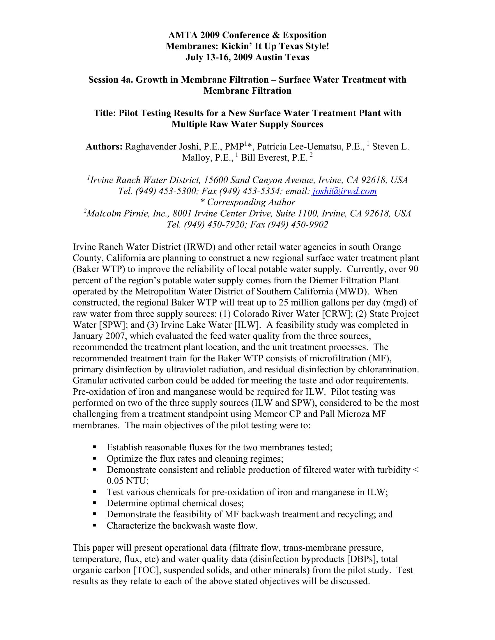| Keywords | Irvine Ranch Water District, Baker WTP, Pilot Testing |