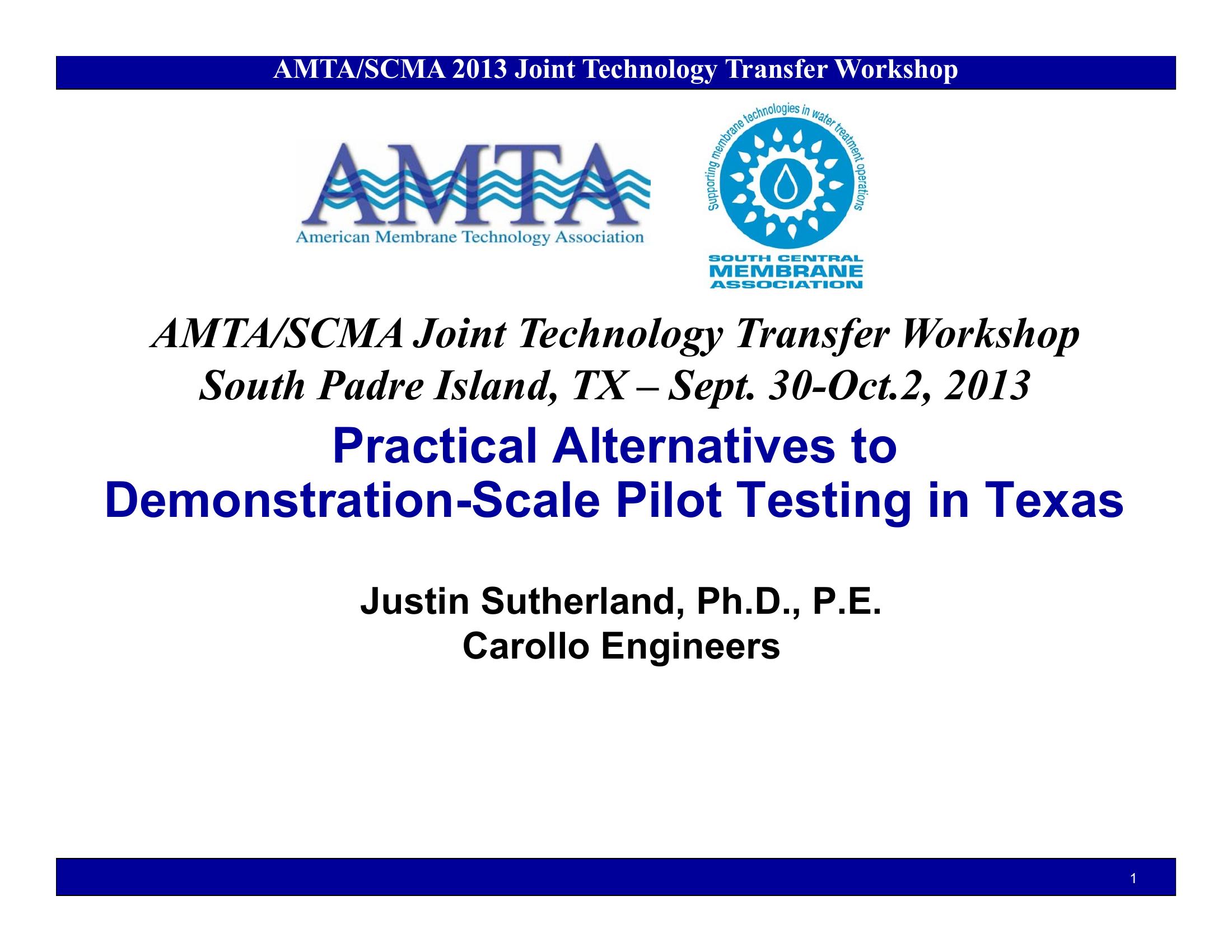 This PowerPoint describes practical alternatives to Demonstration-Scale Pilot Testing in Texas.