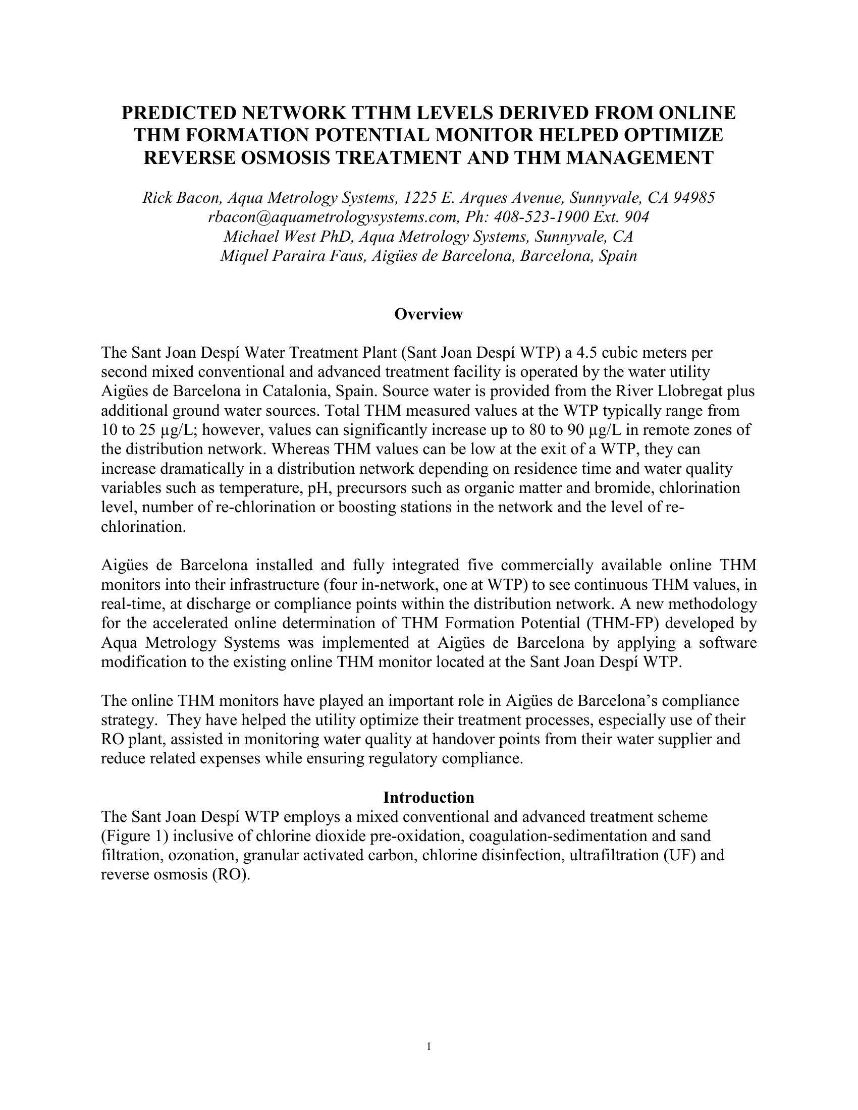 Predicted Network TTHM Levels Derived from Online THM Formation Potential Monitor Helped Optimize Reverse Osmosis Treatment and THM Management