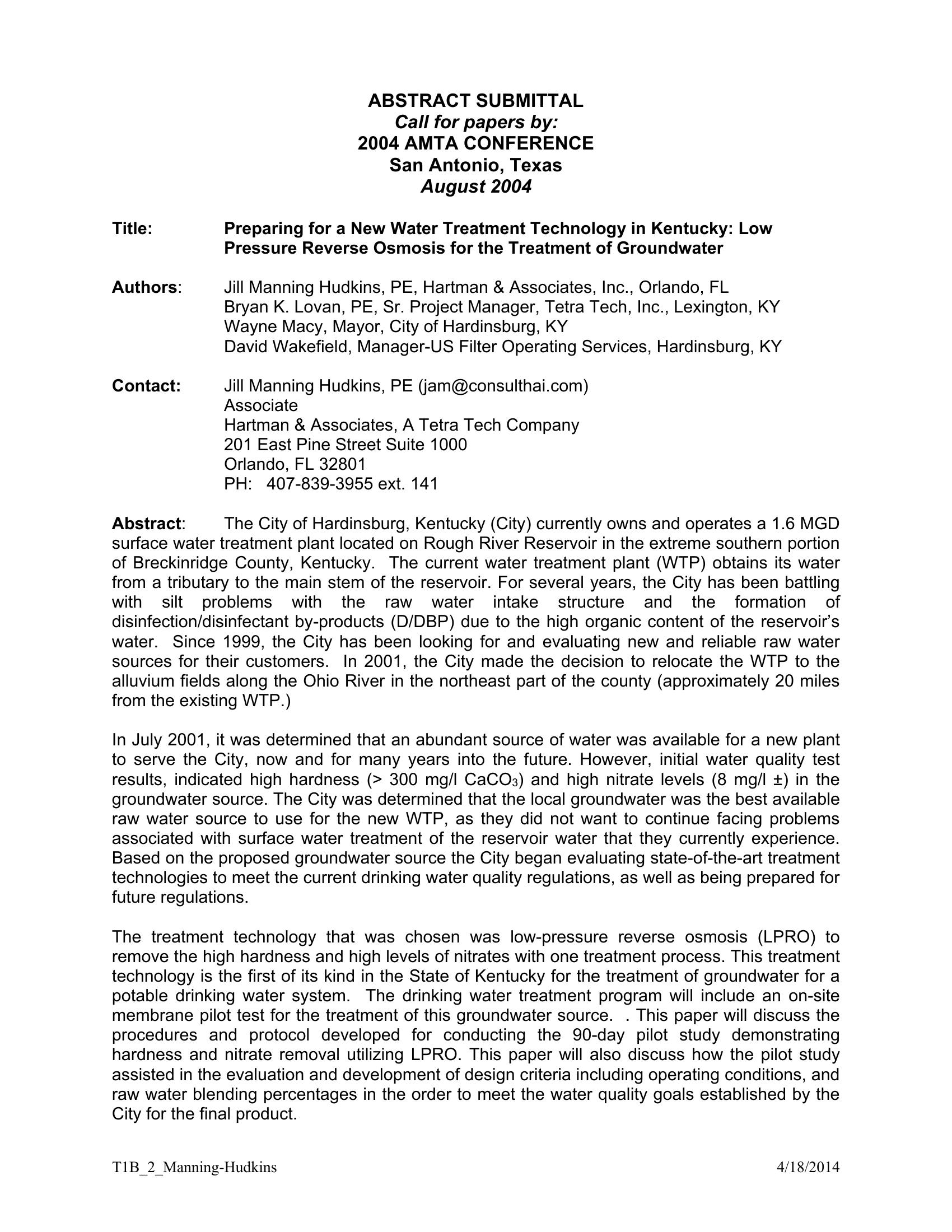 | Keywords | Hardinsburg, Kentucky, Low pressure reverse osmosis, pilot testing |