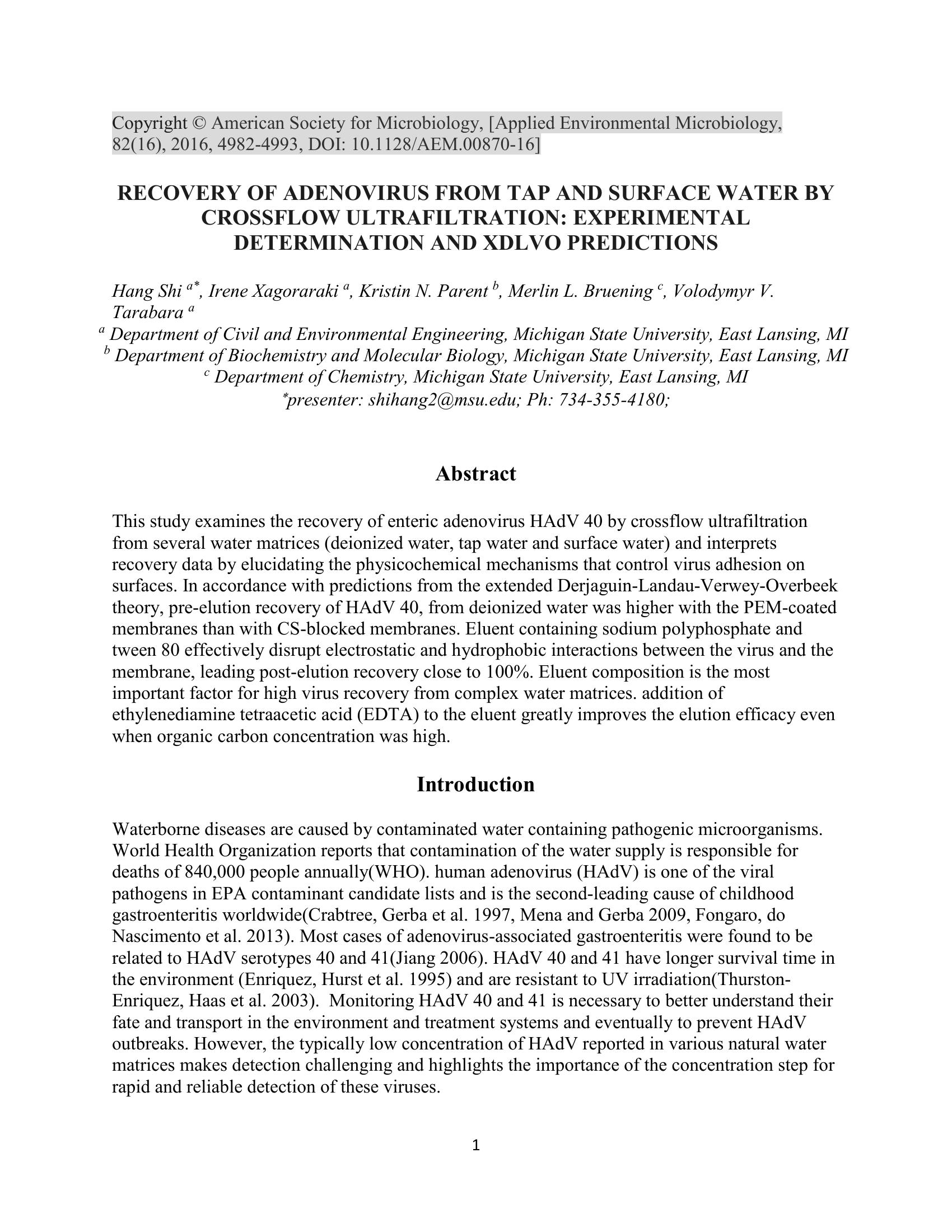 Recovery of Adenovirus from Tap and Surface Water by Crossflow Ultrafiltration: Experimental Determination and XDLVO Predictions