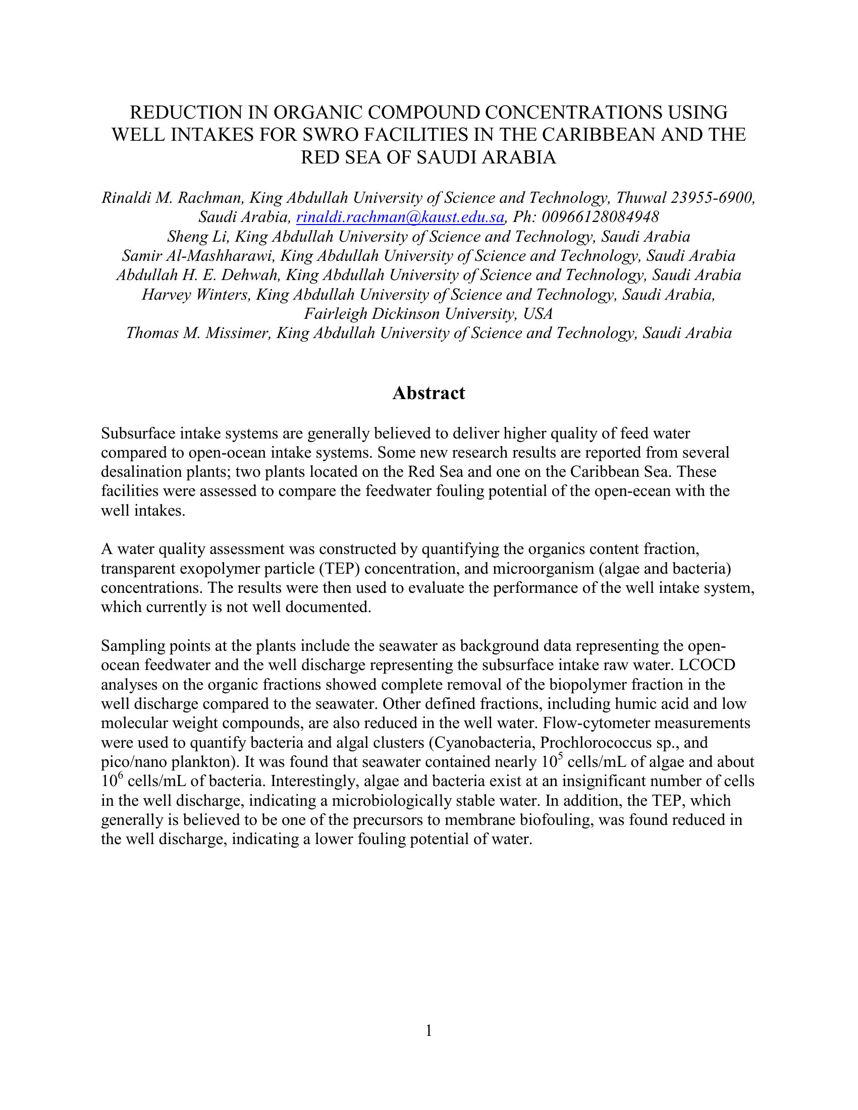 | Keywords | Seawater desalination (SWRO), Well Intakes, TOC reduction |