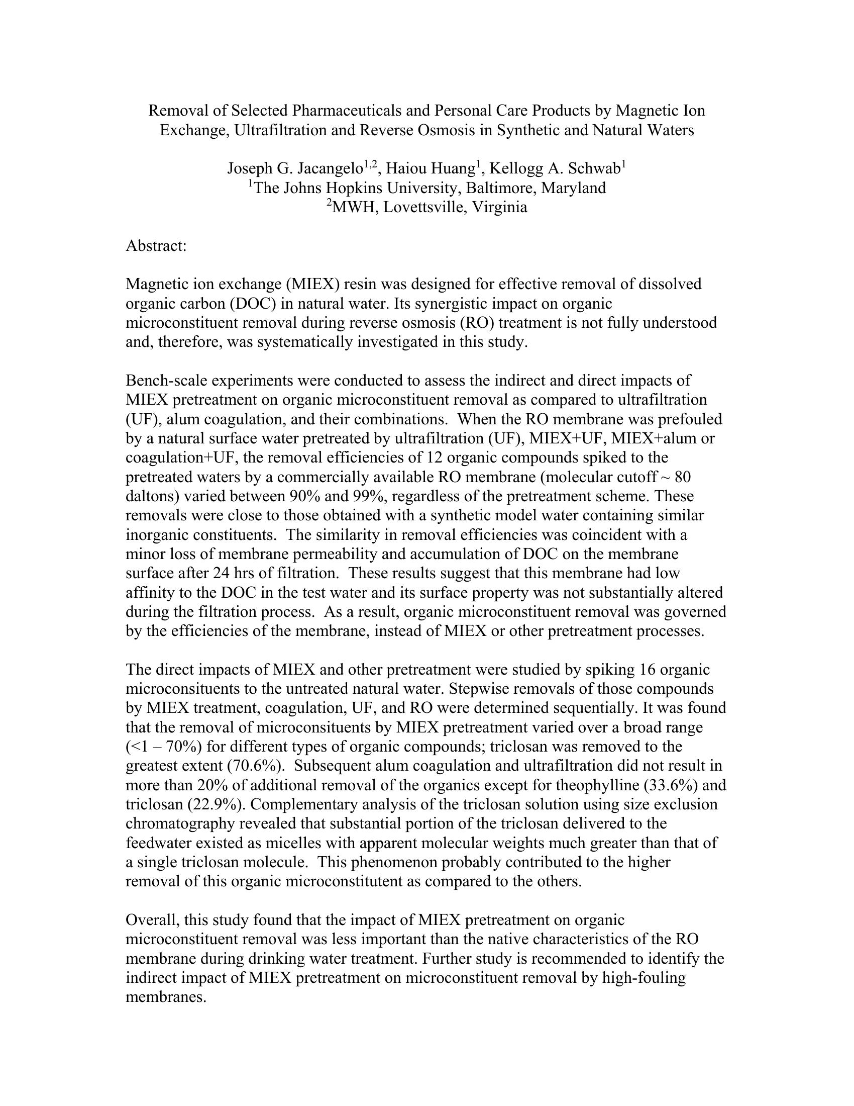 | Keywords | PPCPS, MIEX, Reverse osmosis, ultrafiltration |