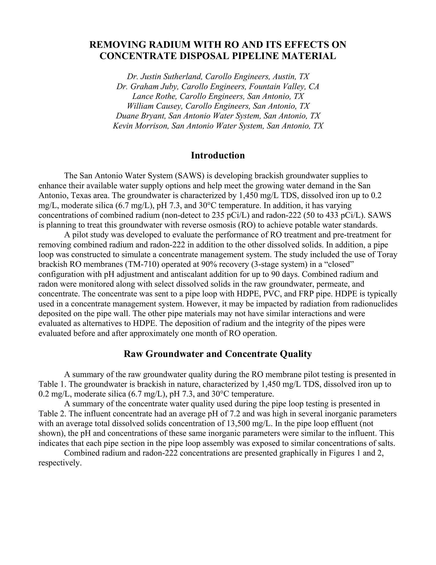 The San Antonio Water System (SAWS) is developing brackish groundwater supplies to enhance their available water supply options and help meet the growing water demand in the San Antonio, Texas area. The groundwater is characterized by 1,400 mg/L TDS, dissolved iron up to 0.7 mg/L, moderate silica (9 mg/L), pH 7.3, and 30¯C temperature. In addition, it has varying concentrations of combined radium (non-detect to 235 pCi/L) and radon-222 (50 to 433 pCi/L). SAWS is planning to treat this groundwater with reverse osmosis (RO) to achieve potable water standards.