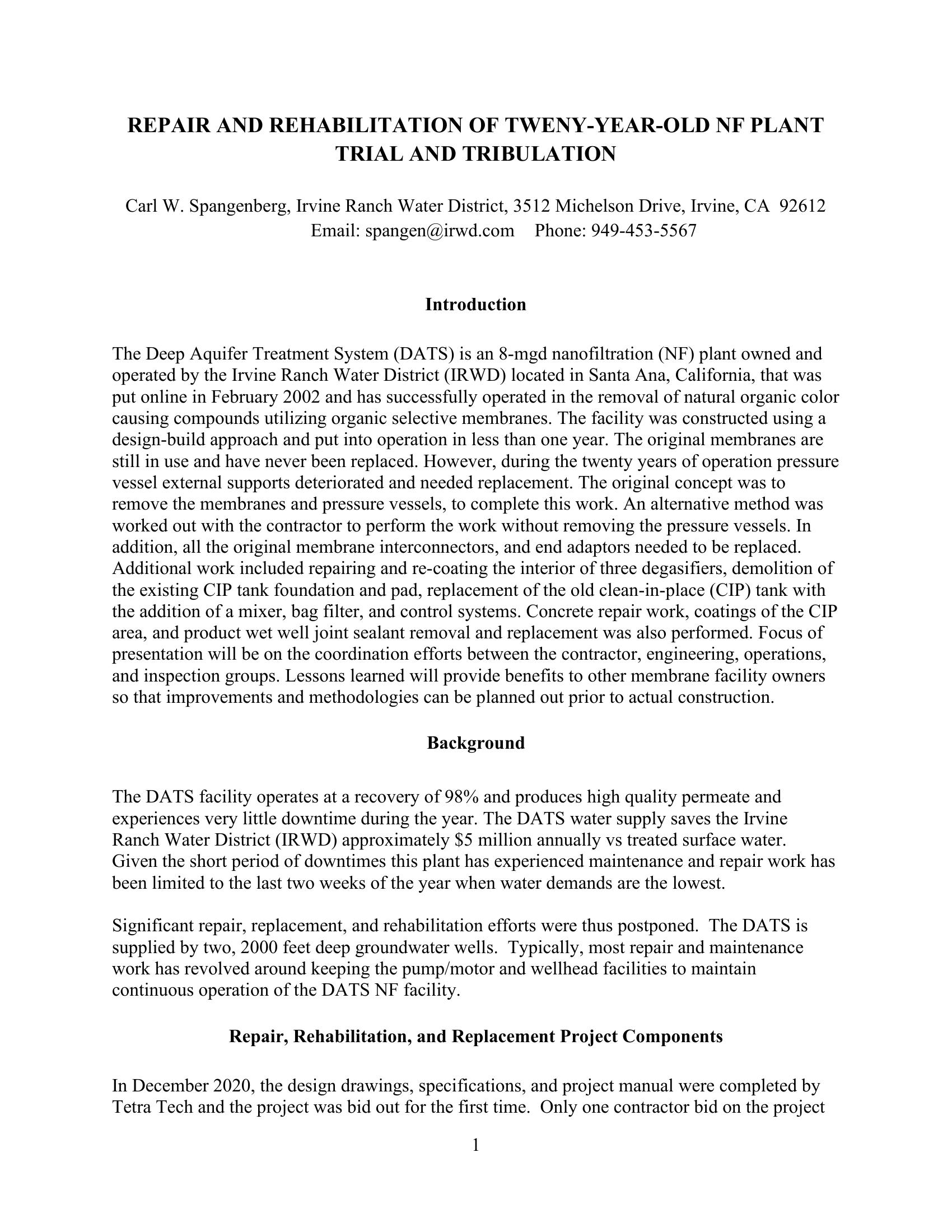 The Deep Aquifer Treatment System (DATS) is an 8-mgd nanofiltration (NF) plant owned and operated by the Irvine Ranch Water District (IRWD) located in Santa Ana, California, that was put online in February 2002 and has successfully operated in the removal of natural organic color causing compounds utilizing organic selective membranes. The facility was constructed using adesign-build approach and put into operation in less than one year. The original membranes are still in use and have never been replaced. However, during the twenty years of operation pressure vessel external supports deteriorated and needed replacement. The original concept was to remove the membranes and pressure vessels, to complete this work. An alternative method was worked out with the contractor to perform the work without removing the pressure vessels. In addition, all the original membrane interconnectors, and end adaptors needed to be replaced. Additional work included repairing and re-coating the interior of three degasifiers, demolition of the existing CIP tank foundation and pad, replacement of the old clean-in-place (CIP) tank with the addition of a mixer, bag filter, and control systems. Concrete repair work, coatings of the CIP area, and product wet well joint sealant removal and replacement was also performed. Focus of presentation will be on the coordination efforts between the contractor, engineering, operations, and inspection groups. Lessons learned will provide benefits to other membrane facility owners so that improvements and methodologies can be planned out prior to actual construction.