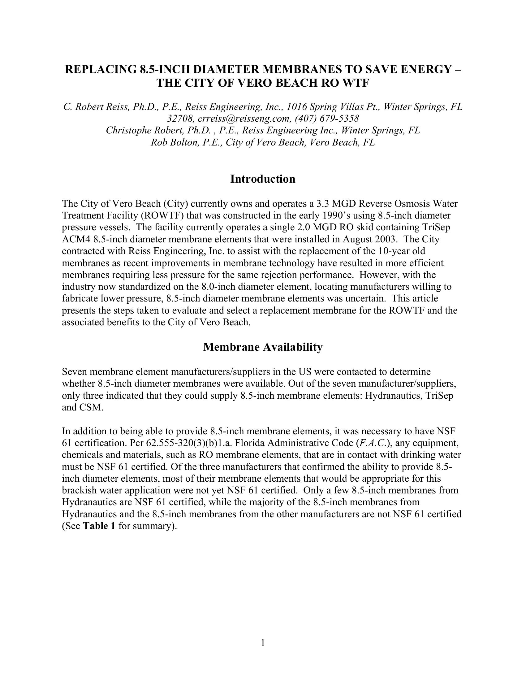 The City of Vero Beach and Reiss Engineering replaced 10-year old 8.5 inch diameter membranes in an existing 2 MGD reverse osmosis skid with more efficient modern elements in order to save energy while maintaining the same rejection performance. This article presents the steps taken to evaluate and select a replacement membrane and the associated benefits to the City.