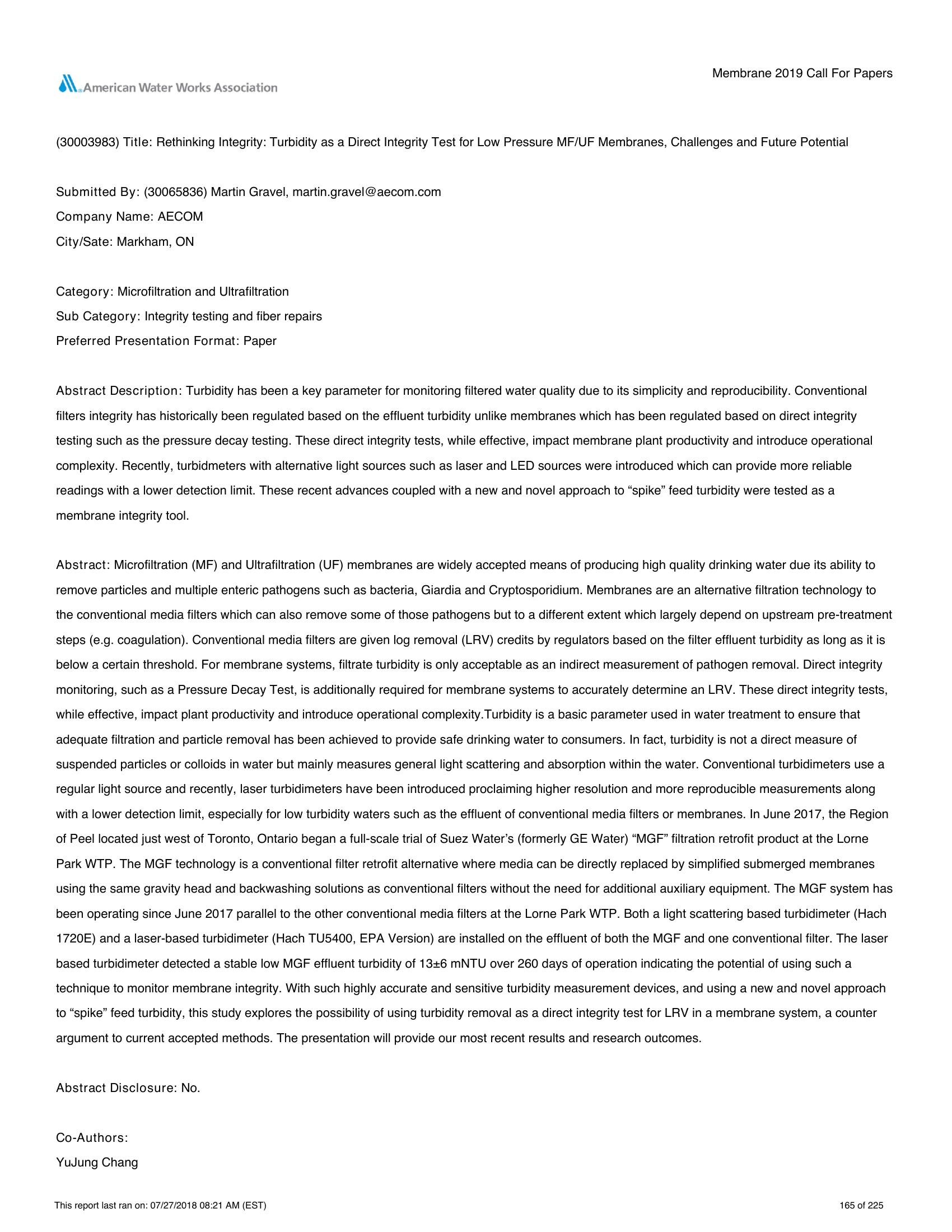 | Keywords | Turbidity, Microfiltration, Ultrafiltration |