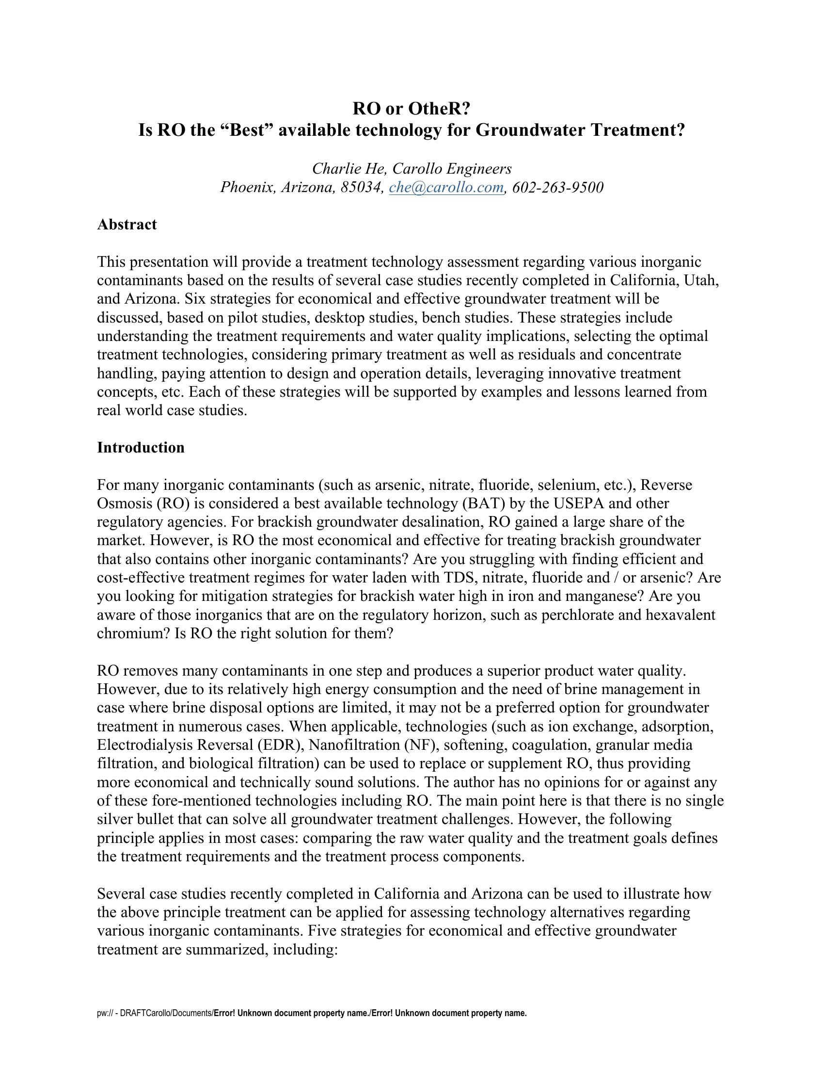 RO or OtheR? Is RO the ?Best? available technology for Groundwater Treatment?