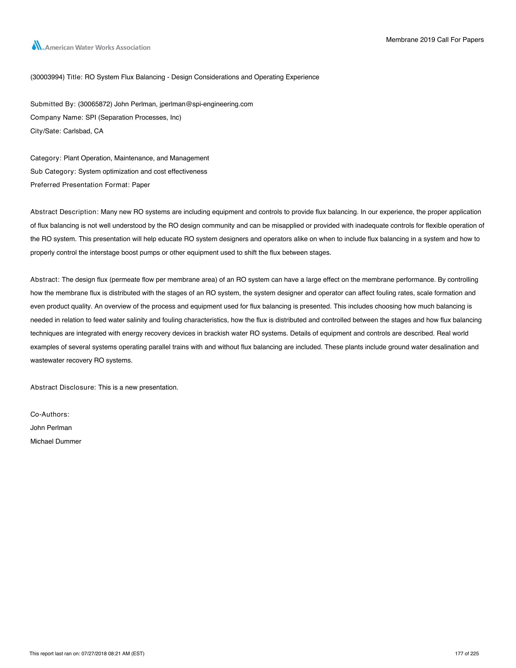 Many new RO systems are including equipment and controls to provide flux balancing. In our experience, the proper application of flux balancing is not well understood by the RO design community and can be misapplied or provided with inadequate controls for flexible operation of the RO system. This presentation will help educate RO system designers and operators alike on when to include flux balancing in a system and how to properly control the interstage boost pumps or other equipment used to shift the flux between stages.