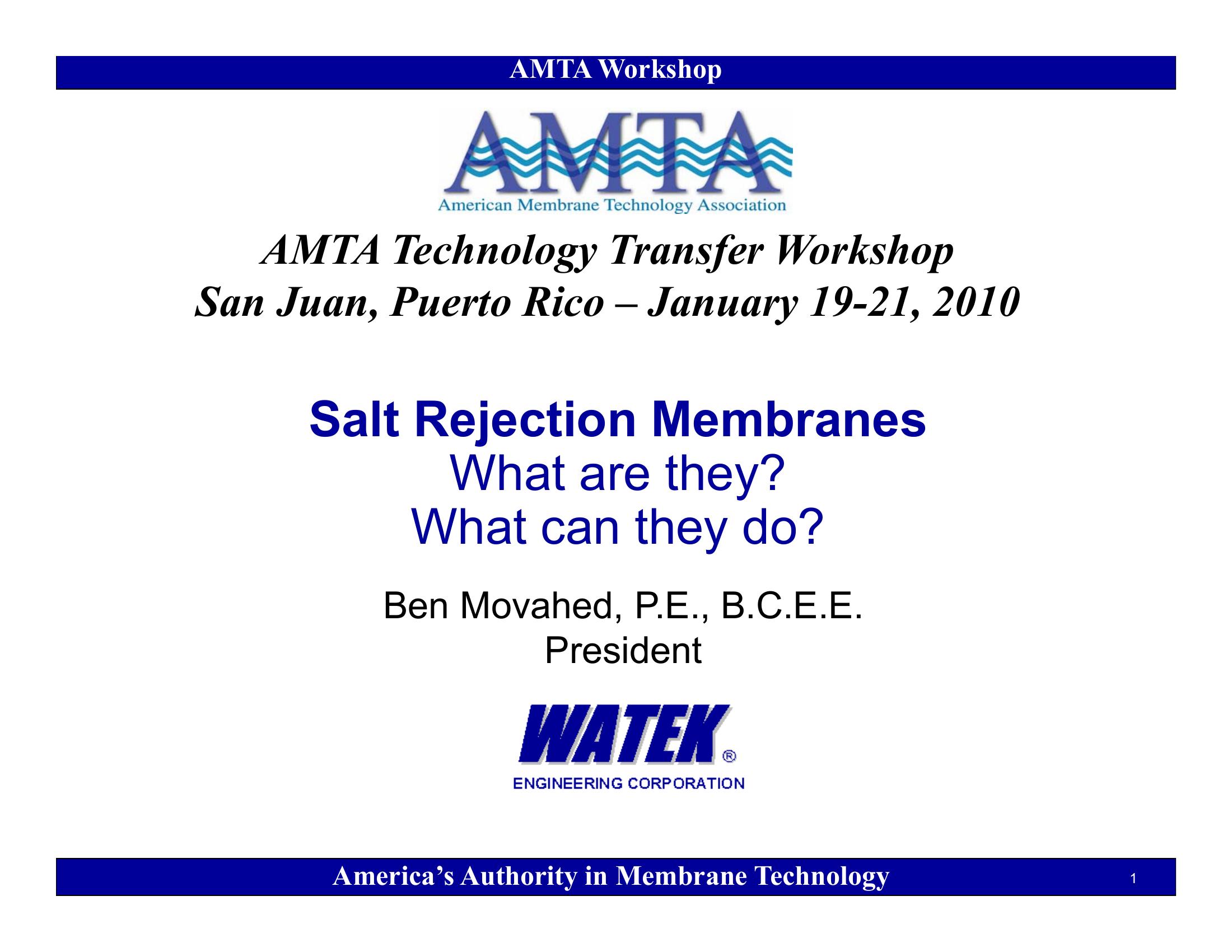 A detailed presentation on salt rejection membrane technology that addresses principles of operation, membrane element construction, desalination plant components and configurations, pretreatment and post treatment, as well as improvements in efficiency and cost.