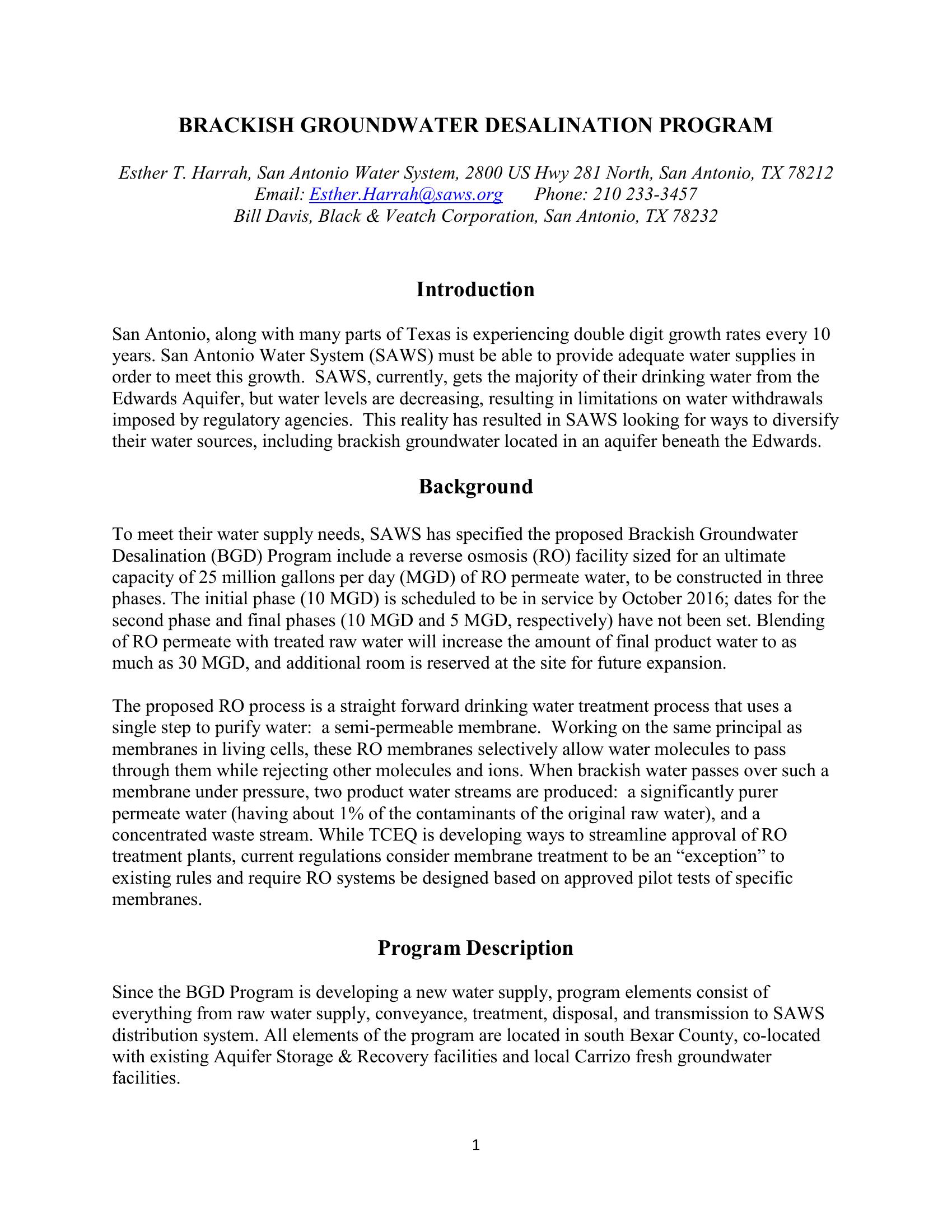 San Antonio, along with many parts of Texas is experiencing double digit growth rates every 10 years. San Antonio Water System (SAWS) must be able to provide adequate water supplies in order to meet this growth. SAWS, currently gets the majority of their drinking water from the Edwards Aquifer, but water levels are decreasing, resulting in limitations on water withdrawals imposed by regulatory agencies. This reality has resulted in SAWS looking for ways to diversify their water sources, including brackish groundwater located in an aquifer beneath the Edwards.