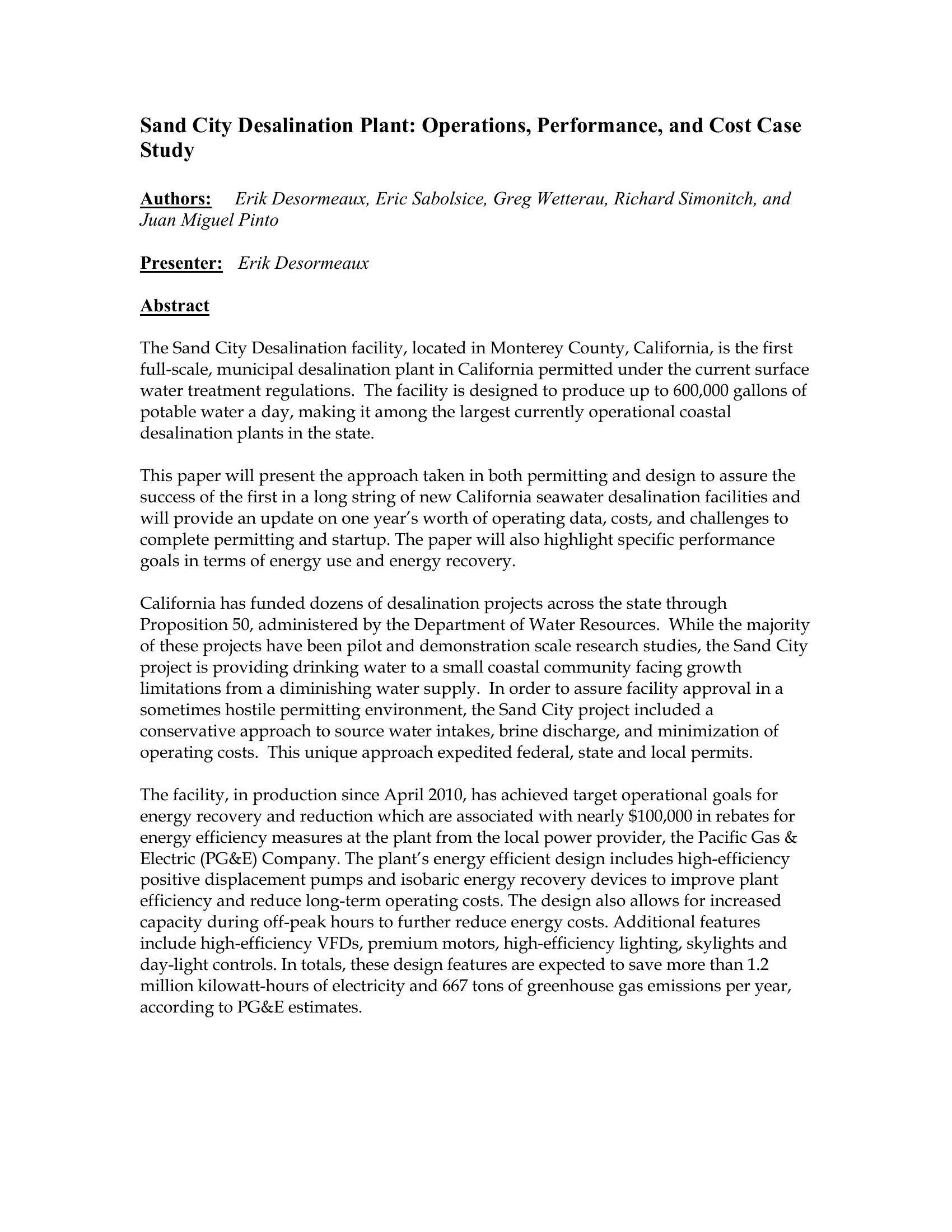 Sand City Desalination Plant: Operations, Performance, and Cost Case Study