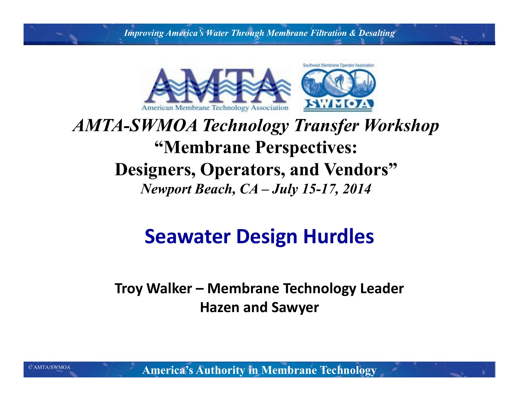 This presentation provides design considerations for the construction of seawater desalting facilities. The presentation is divided into sections for intake, pretreatment, reverse osmosis process, and post-treatment design. Key topics include corrosion management and energy recovery.