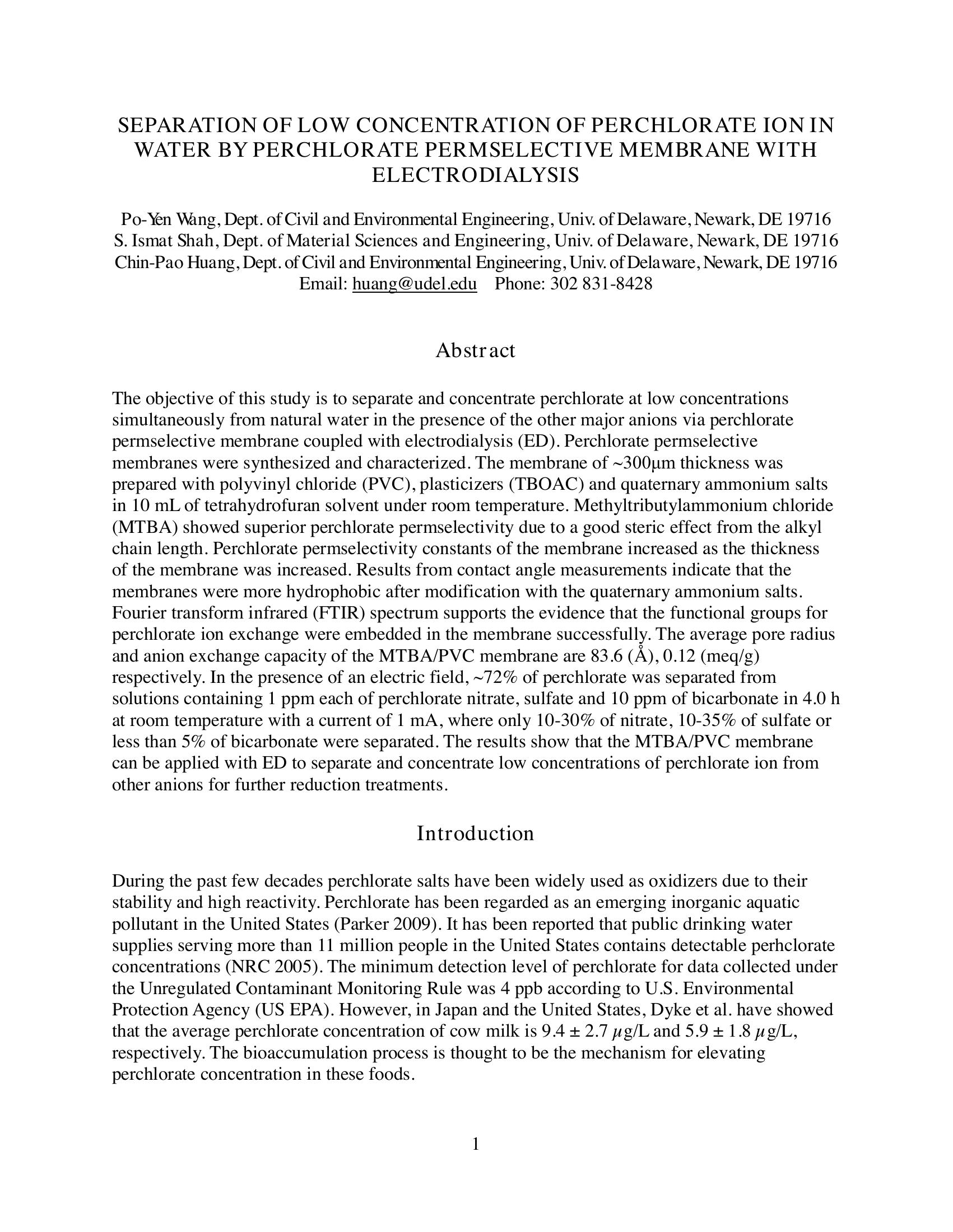 This paper describes the study to separate and concentrate perchlorate at low concentrations simultaneously from natural water in the presence of the other major anions via perchlorate permselective membrane coupled with electrodialysis (ED). The results show that the MTBA/PVC membrane can be applied with ED to separate and concentrate low concentrations of perchlorate ion from other anions for further