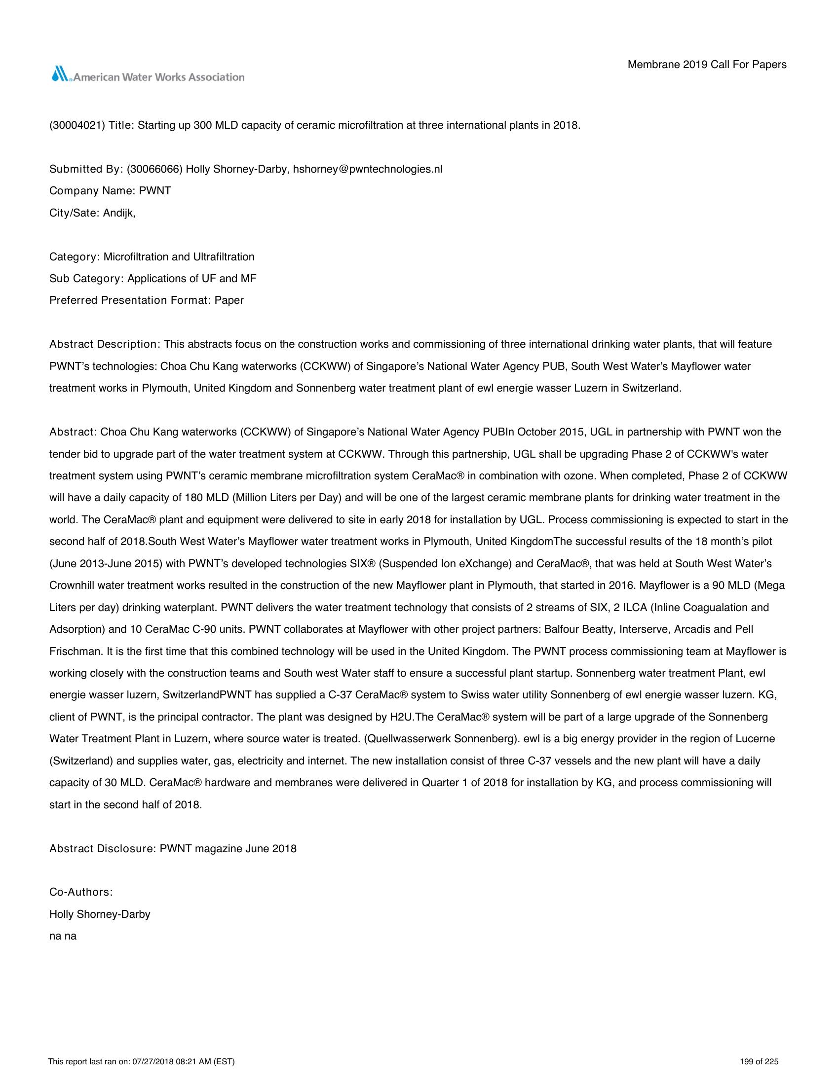 Starting up 300 MLD Capacity of Ceramic Microfiltration at Three International Plants in 2018