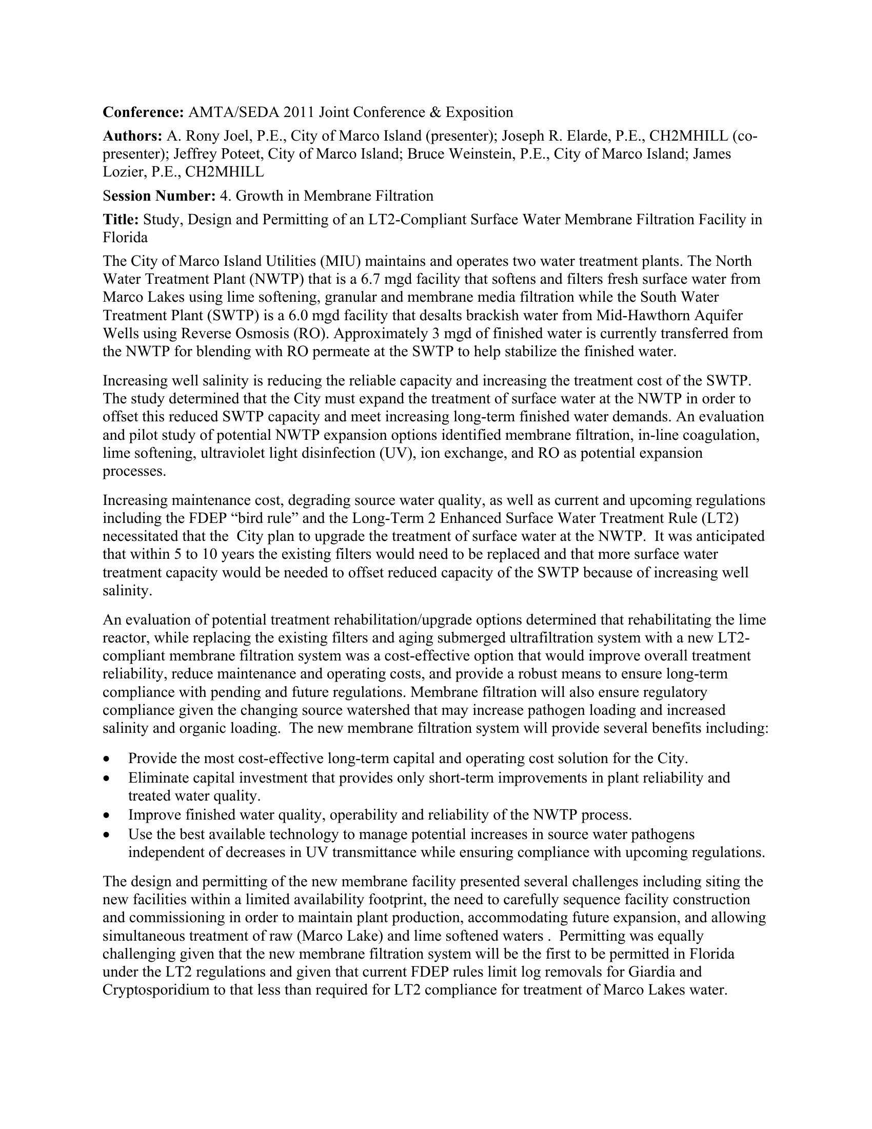 This paper discusses the study, design and permitting of the Marco Island surface water membrane filtration system and describes how the project met the City’s needs while meeting several logistical and permitting challenges.