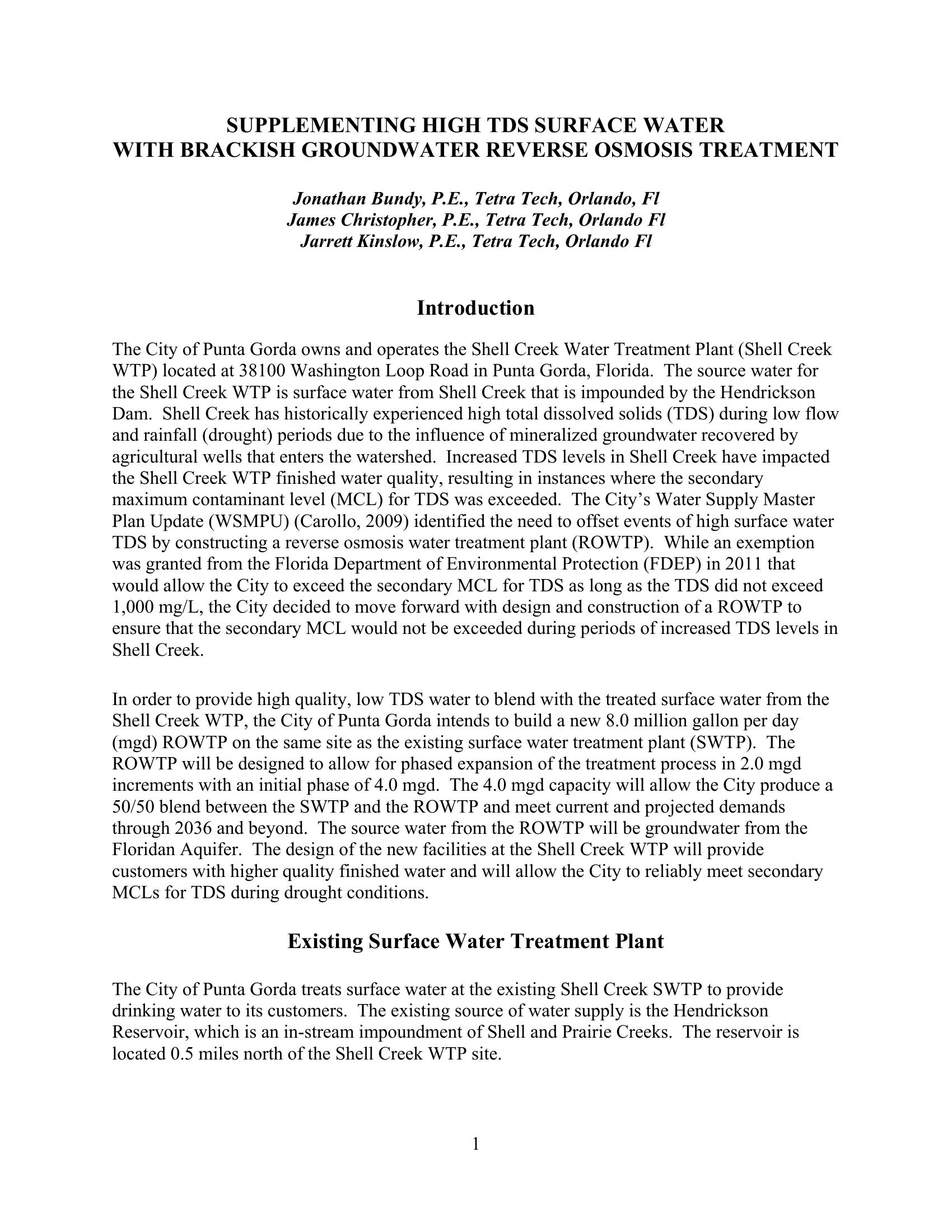 This paper describes the design of an 8 MGD reverse osmosis treatment plant in the City of Punta Gorda Florida to meet current and projected demands through 2036 and beyond. The source water from the ROWTP will be groundwater from the Floridan Aquifer. The design of the new facilities at the Shell Creek WTP will provide customers with higher quality finished water and will allow the City to reliably meet secondary MCLs for TDS during drought conditions.