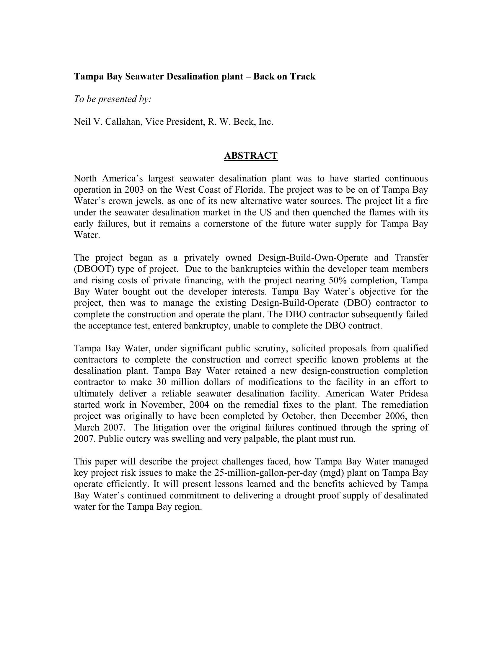 North America’s largest seawater desalination plant was to have started continuous operation in 2003 on the West Coast of Florida. The project began as a privately owned Design-Build-Own-Operate and Transfer (DBOOT) type of project. This paper will describe the project challenges faced, how Tampa Bay Water managed key project risk issues to make the 25-million-gallon-per-day (mgd) plant on Tampa Bay operate efficiently. It will present lessons learned and the benefits achieved by Tampa Bay Water’s continued commitment to delivering a drought proof supply of desalinated water for the Tampa Bay region.