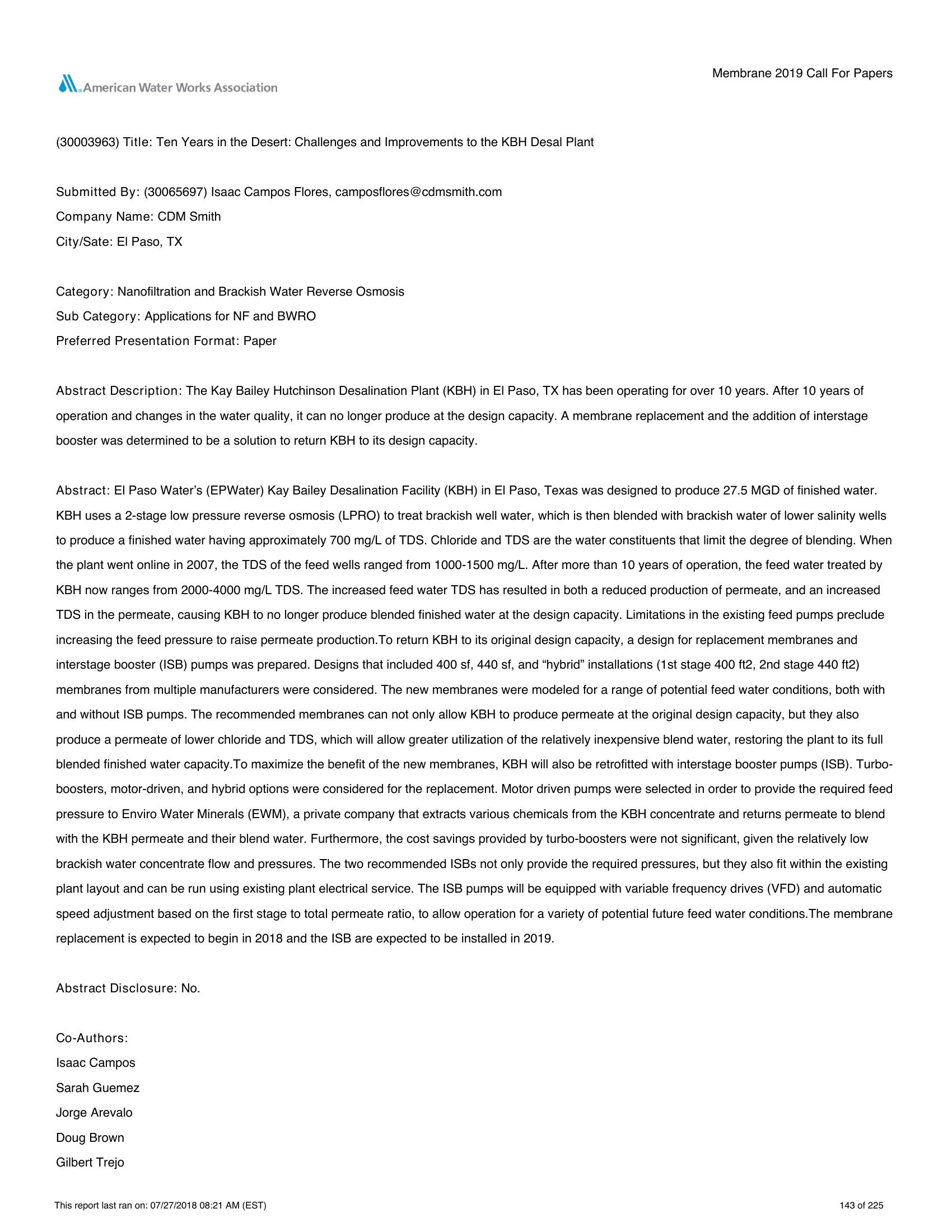 The Kay Bailey Hutchinson Desalination Plant (KBH) in El Paso, TX has been operating for over 10 years. After 10 years of operation and changes in the water quality, it can no longer produce at the design capacity. A membrane replacement and the addition of interstage booster was determined to be a solution to return KBH to its design capacity.