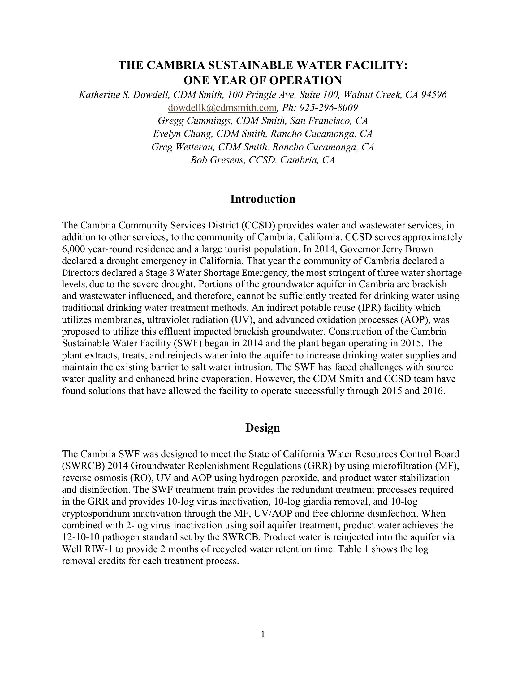 The Cambria Sustainable Water Facility is an indirect potable reuse facility located along the central coast of California. This presentation will focus on start-up and operation of the plant, including operational challenges and product water quality.