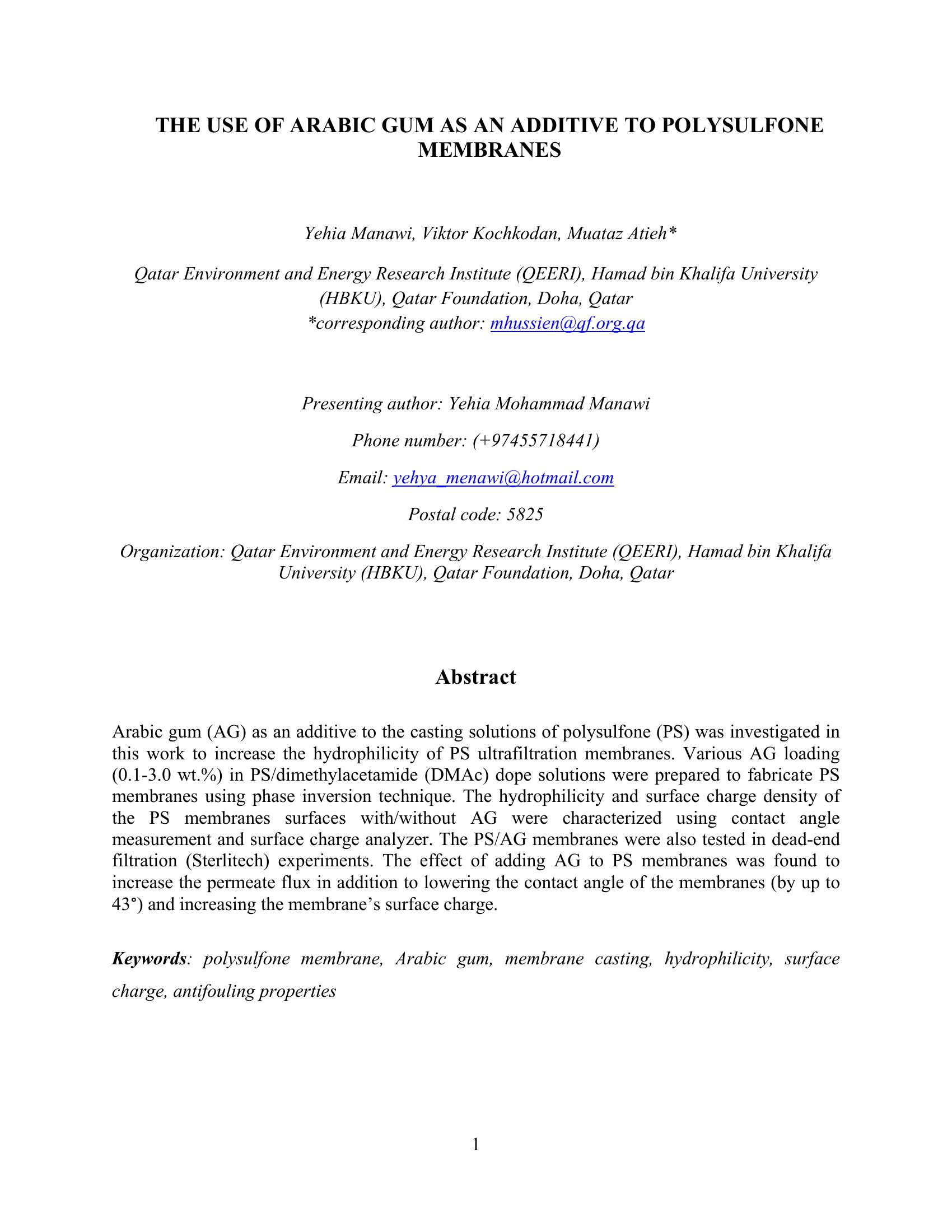 | Keywords | polysulfone membrane, Arabic gum, membrane casting, hydrophilicity, surface charge, antifouling properties |