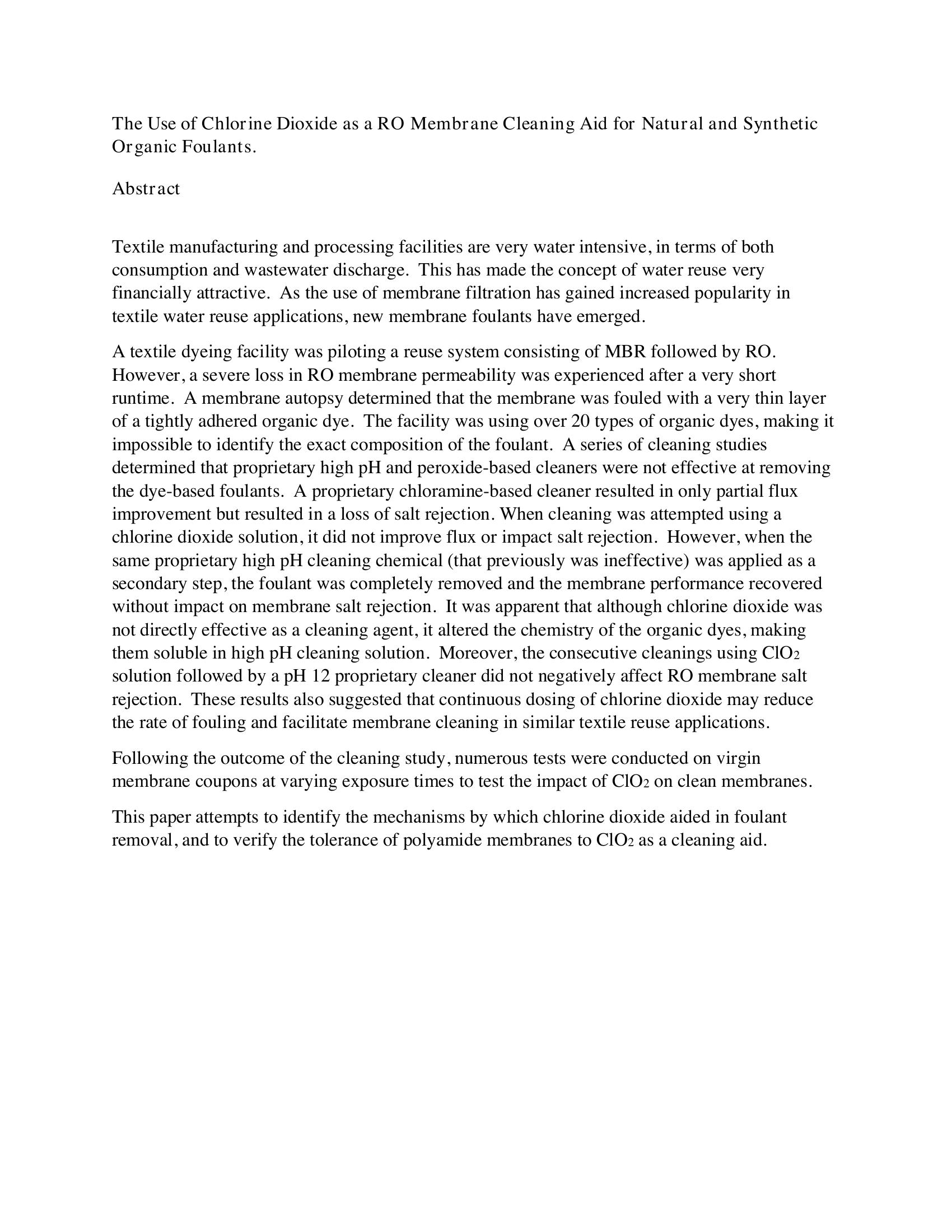 | Keywords | Chlorine Dioxide, Foulant Removal, Polyamide Membranes |