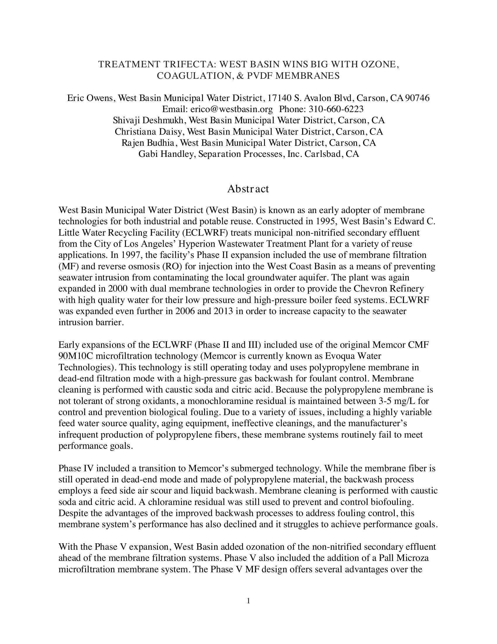 | Keywords | West Basin, Microfiltration (MF), Submerged membranes, ozonation |
