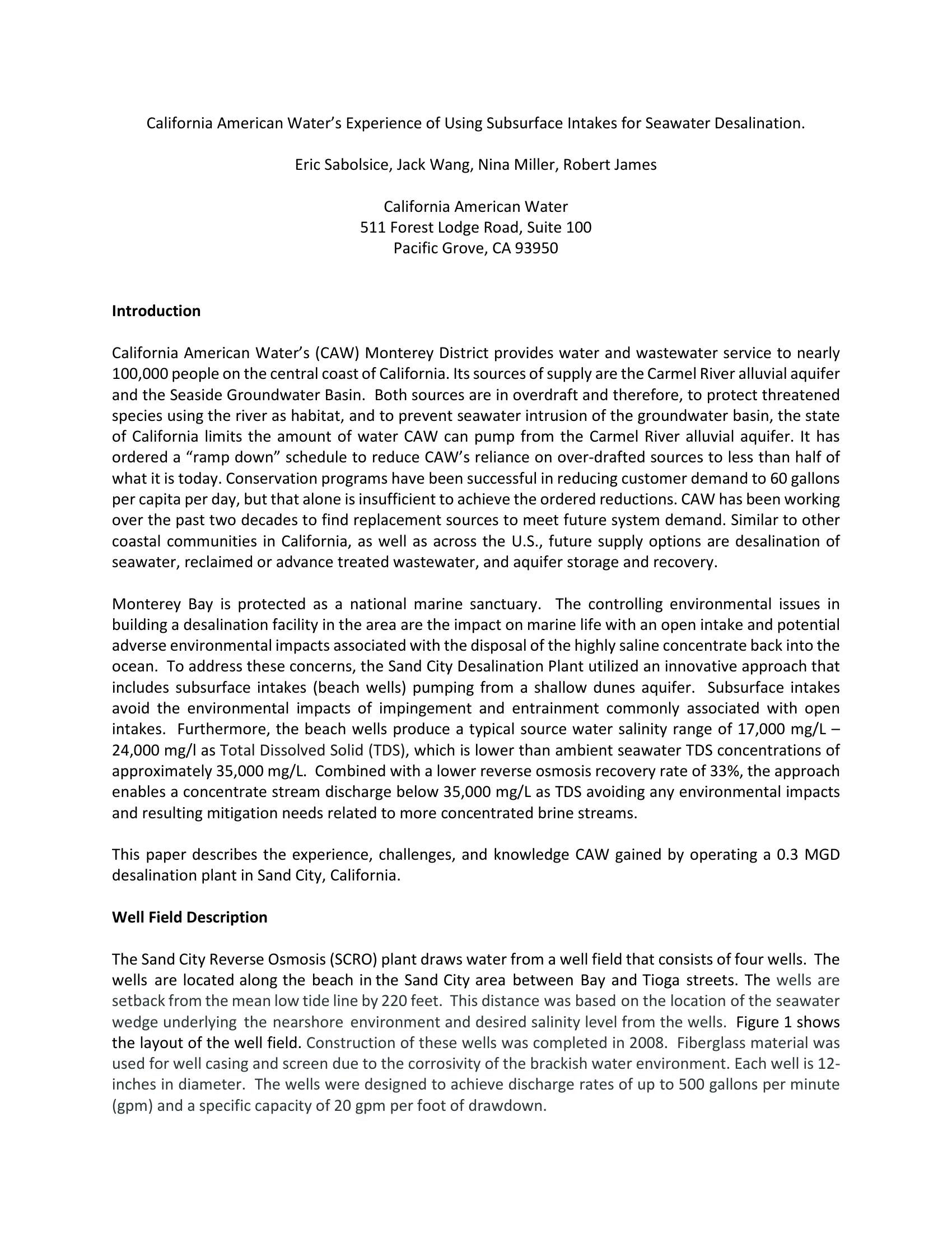 Use of Subsurface Intakes for Seawater Desalination in Monterey, California