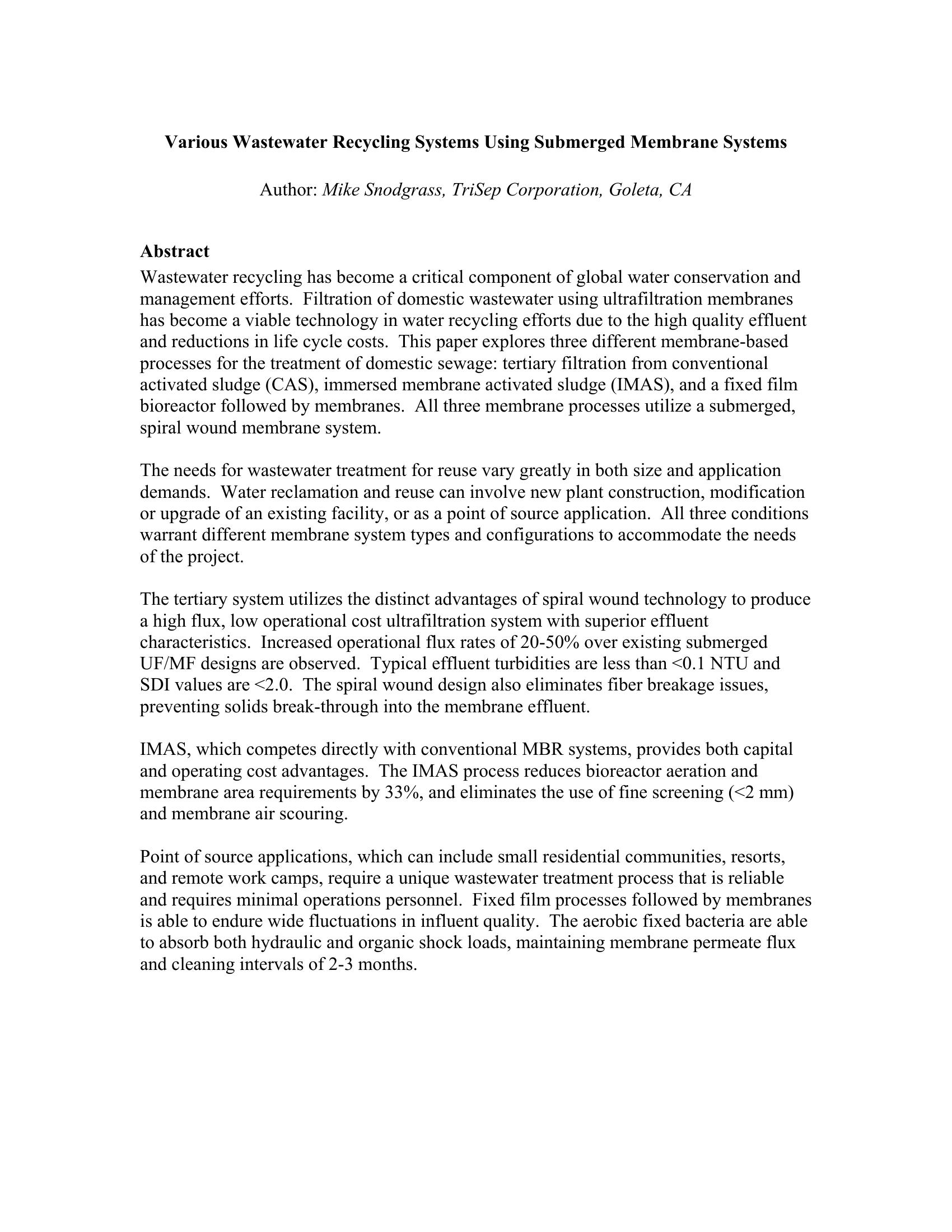 | Keywords | Submerged Membrane Systems, spiral wound ultrafiltration |