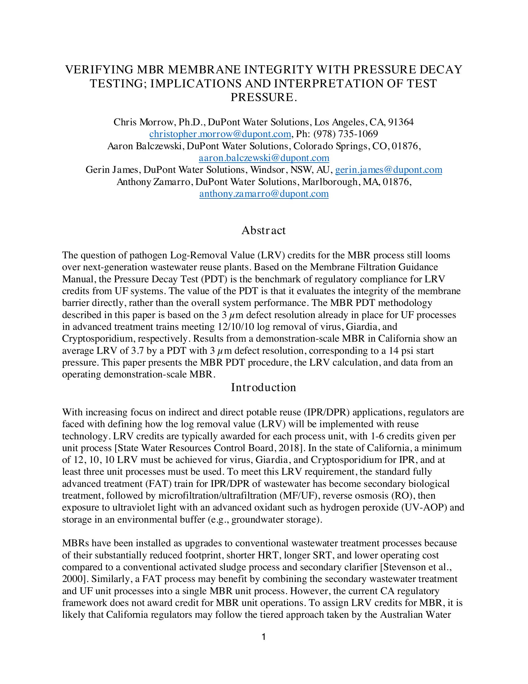The question of pathogen Log-Removal Value (LRV) credits for the MBR process still looms over next-generation wastewater reuse plants. Based on the Membrane Filtration Guidance Manual, the Pressure Decay Test (PDT) is the benchmark of regulatory compliance for LRV credits from UF systems. The value of the PDT is that it evaluates the integrity of the membrane barrier directly, rather than the overall system performance. The MBR PDT methodology described in this paper is based on the 3 ?m defect resolution already in place for UF processes in advanced treatment trains meeting 12/10/10 log removal of virus, Giardia, and Cryptosporidium, respectively. Results from a demonstration-scale MBR in California show an average LRV of 3.7 by a PDT with 3 ?m defect resolution, corresponding to a 14 psi start pressure. This paper presents the MBR PDT procedure, the LRV calculation, and data from an operating demonstration-scale MBR.
