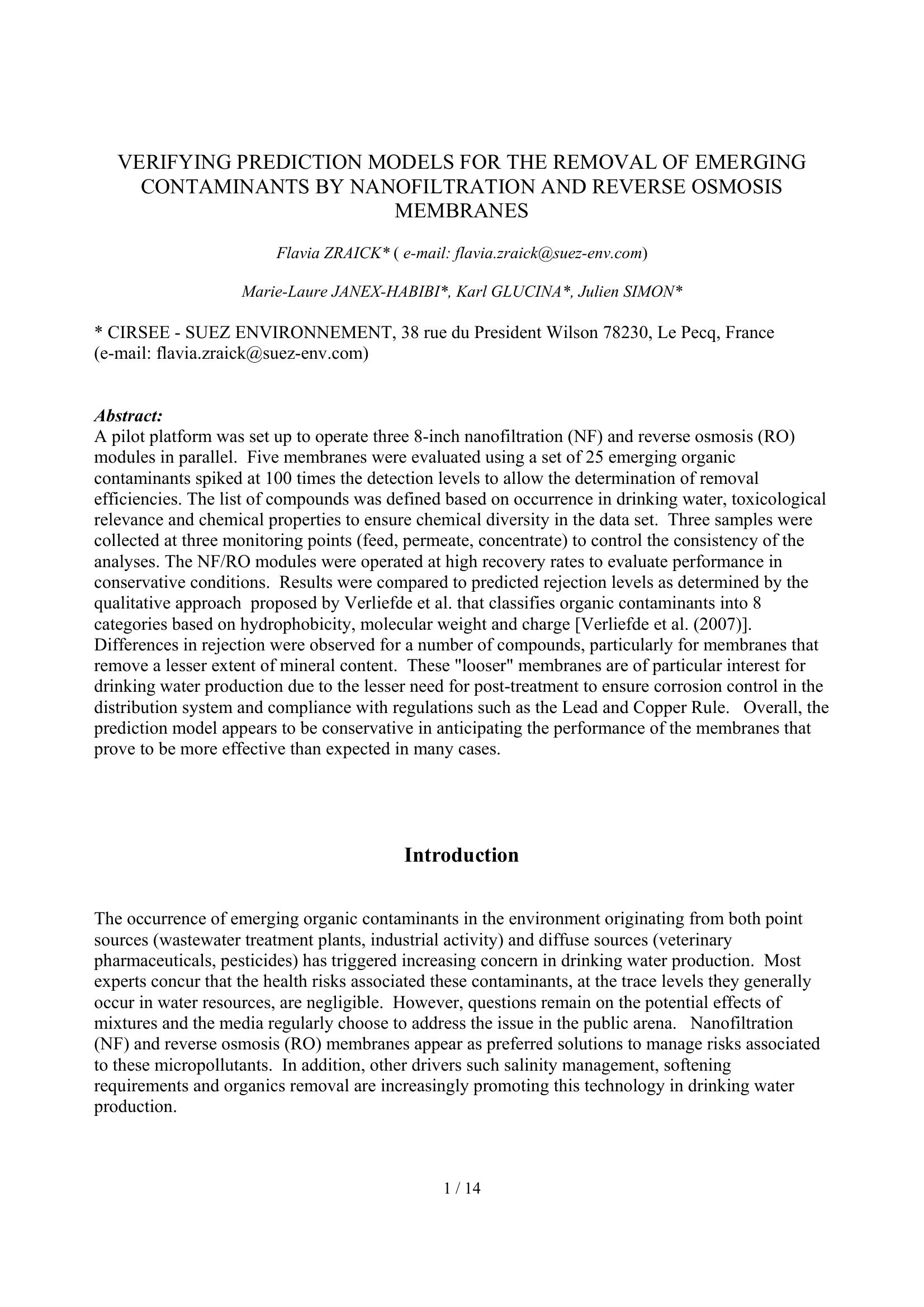 | Keywords | Reverse Osmosis, Nanofiltration, Emerging Contaminants |