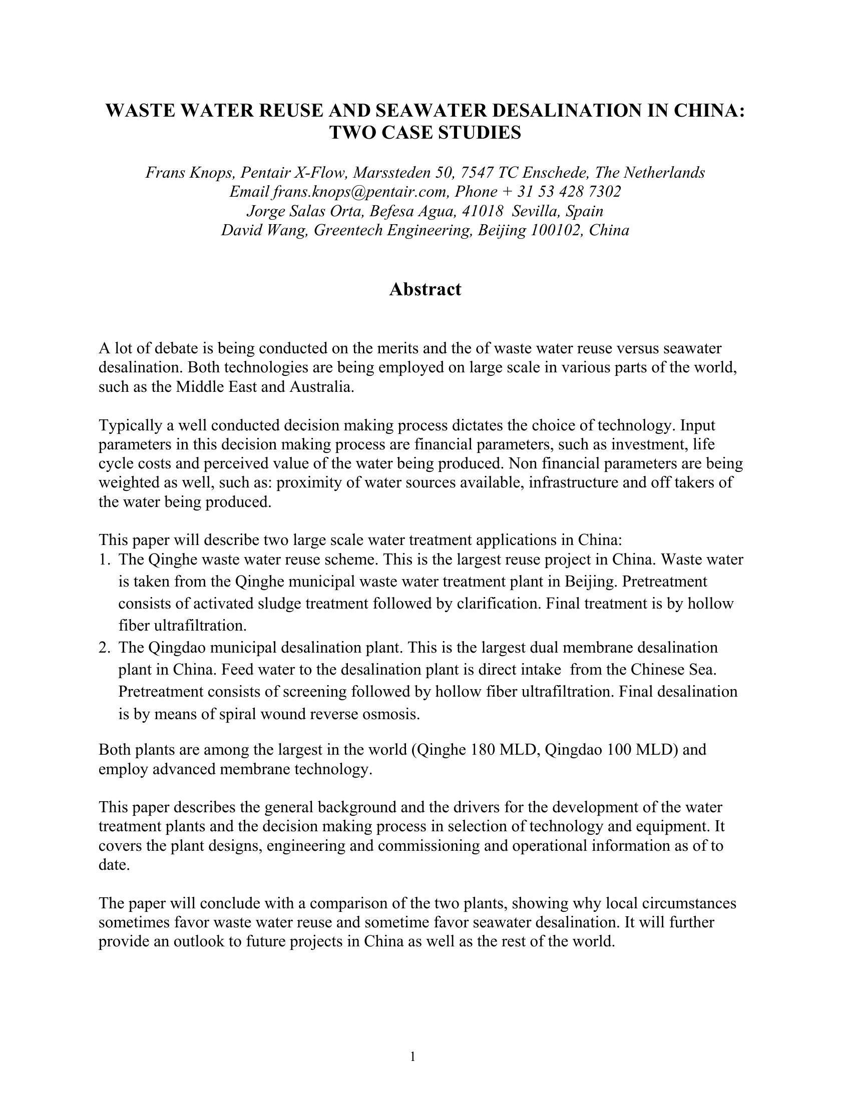 Waste Water Reuse and Seawater Desalination in China: Two Case Studies