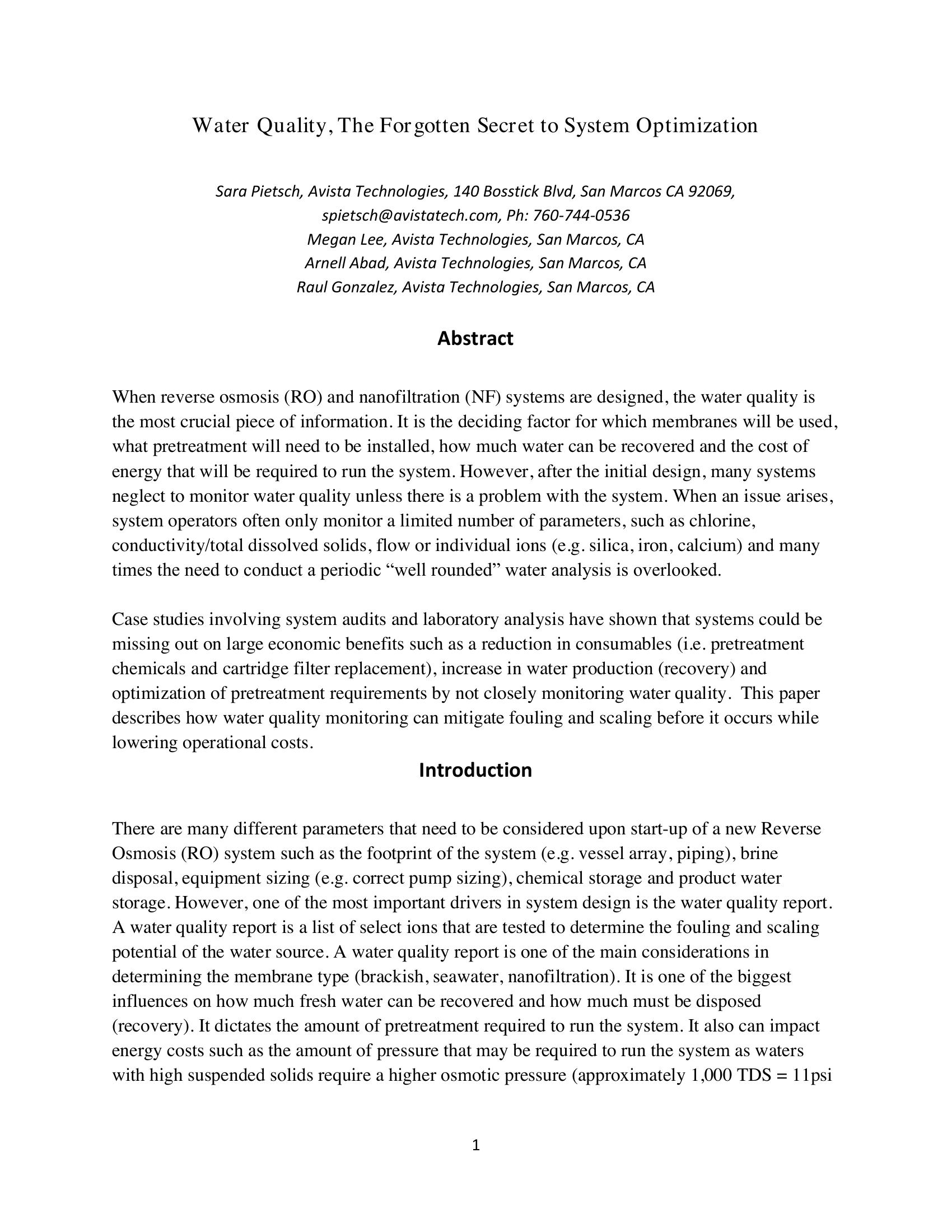 When reverse osmosis (RO) and nanofiltration (NF) systems are designed, the water quality is the most crucial piece of information. It is the deciding factor for which membranes will be used, what pretreatment will need to be installed, how much water can be recovered and the cost of energy that will be required to run the system. However, after the initial design, many systems neglect to monitor water quality unless there is a problem with the system. When an issue arises, system operators often only monitor a limited number of parameters, such as chlorine, conductivity/total dissolved solids, flow or individual ions (e.g. silica, iron, calcium) and many times the need to conduct a periodic ìwell roundedî water analysis is overlooked. Case studies involving system audits and laboratory analysis have shown that systems could be missing out on large economic benefits such as a reduction in consumables (i.e. pretreatment chemicals and cartridge filter replacement), increase in water production (recovery) and optimization of pretreatment requirements by not closely monitoring water quality. This paper describes how water quality monitoring can mitigate fouling and scaling before it occurs while lowering operational costs.