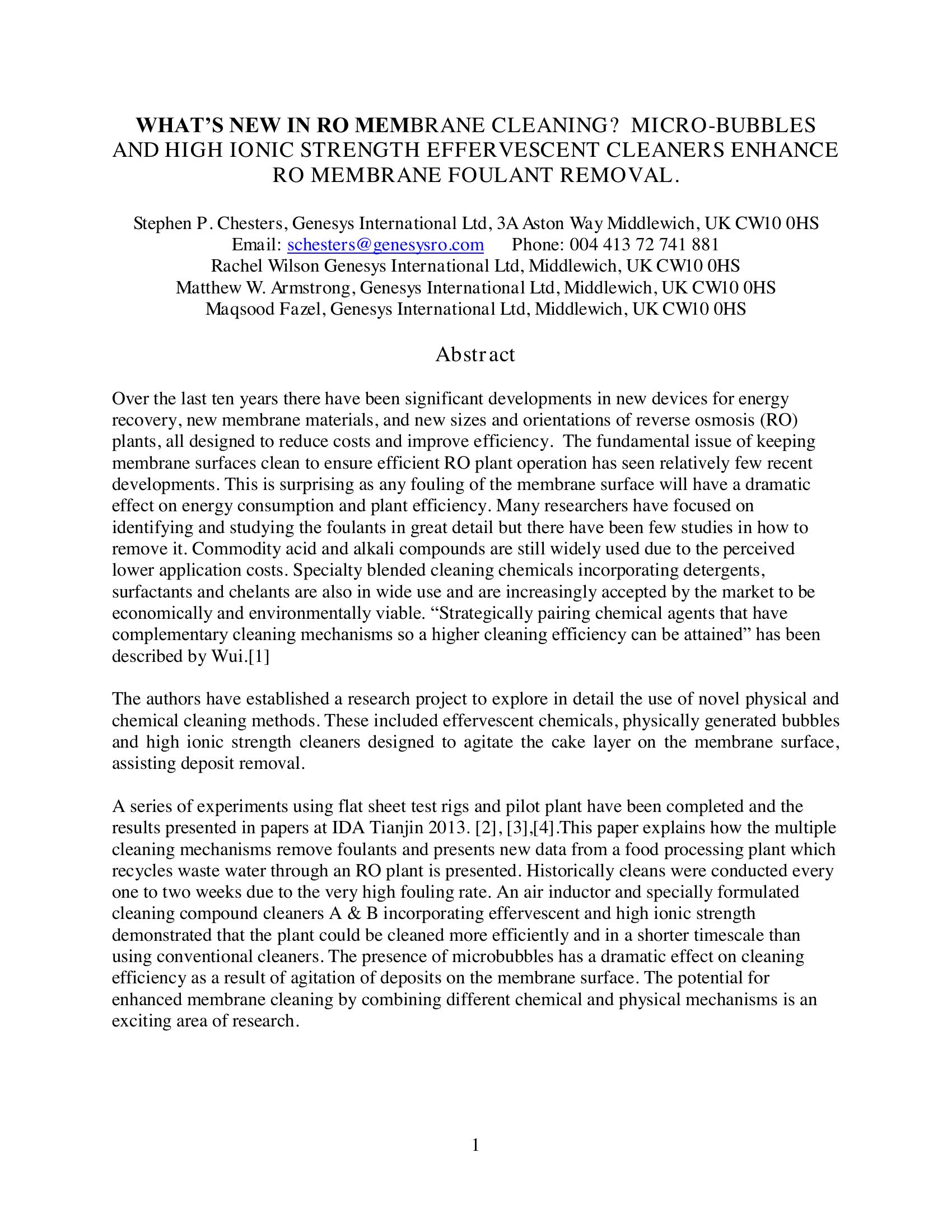 What?s New in RO Membrane Cleaning? Micro-Bubbles and High Ionic Strength Effervescent Cleaners Enhance RO Membrane Foulant Removal