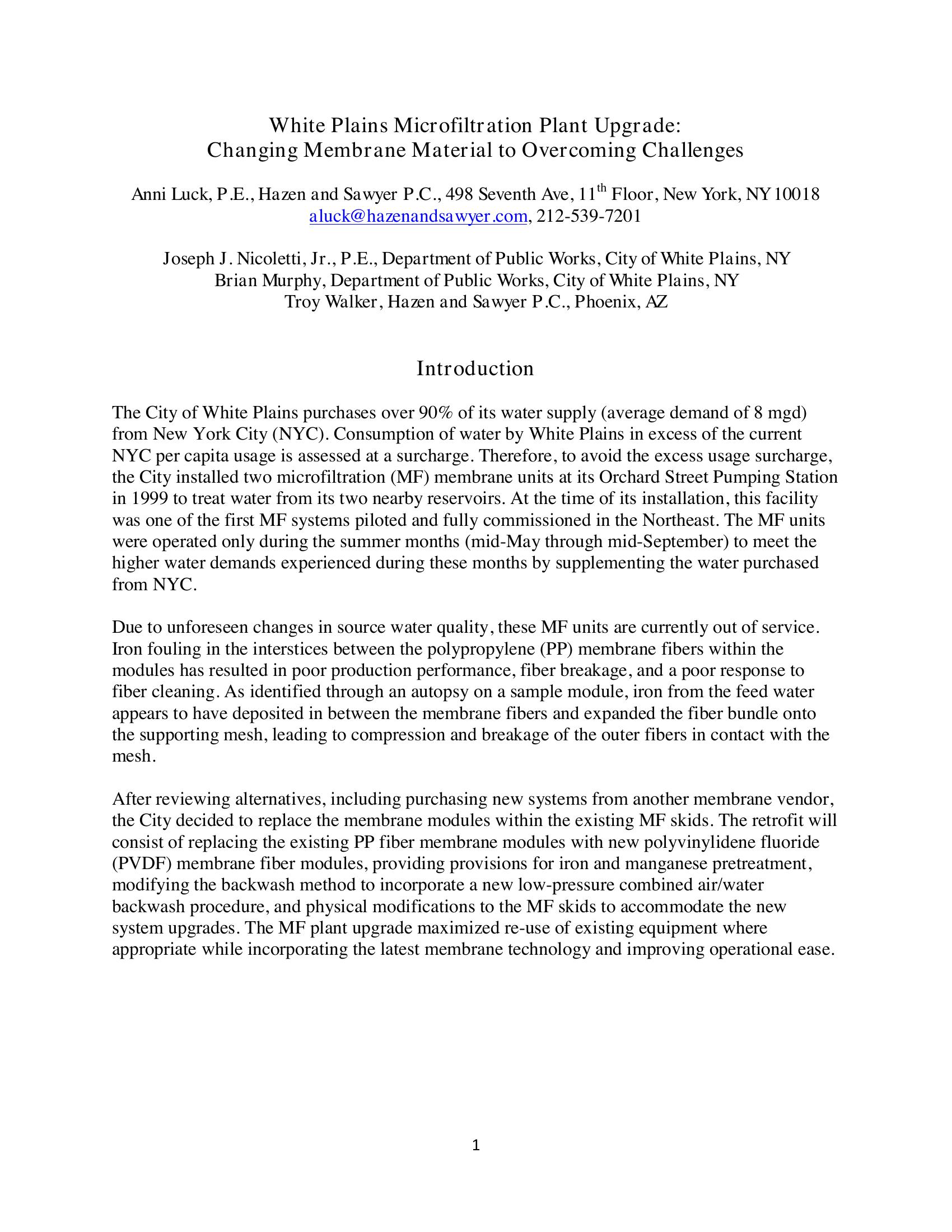 This paper provides an overview of the drivers for the microfiltration (MF) upgrade project in White Plains, NY, while elaborating on benefits, challenges, and lessons learned.