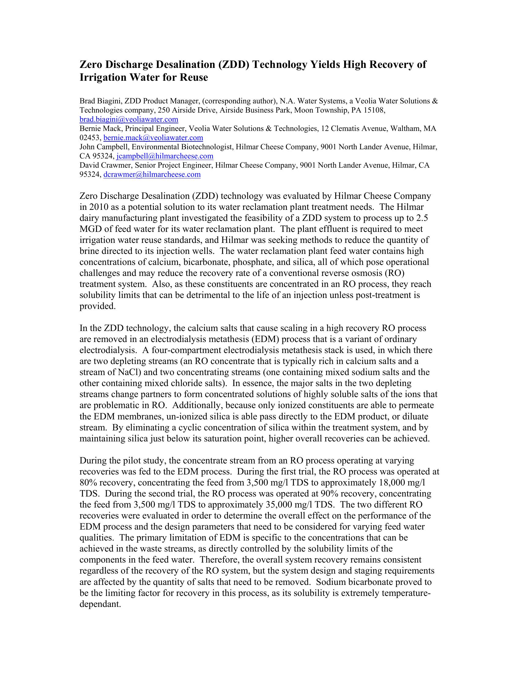 The paper describes two phases of pilot testing to demonstrate that ZDD technology successfully achieved the water treatment goals at Hilmar Cheese. By combining RO and EDM technologies, the scaling concerns prevalent with a conventional RO treatment approach (calcium phosphate, calcium carbonate, silica) were eliminated.